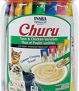 INABA Churu Cat Treats, Grain-Free, Lickable, Squeezable Creamy Purée Cat Treat/Topper with Vitamin E & Taurine, 0.5 Ounces Each Tube, 50 Tubes, Tuna & Chicken Variety